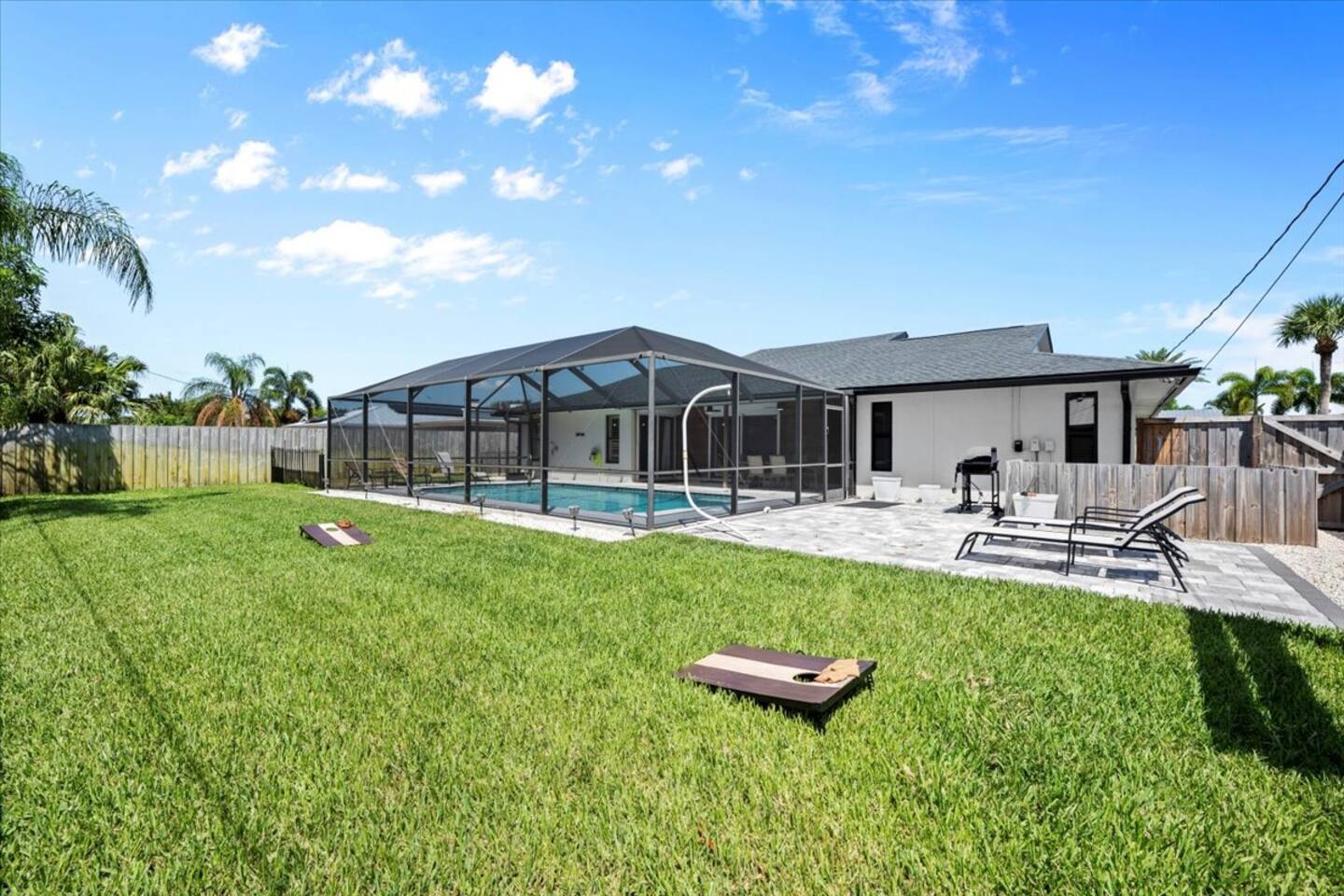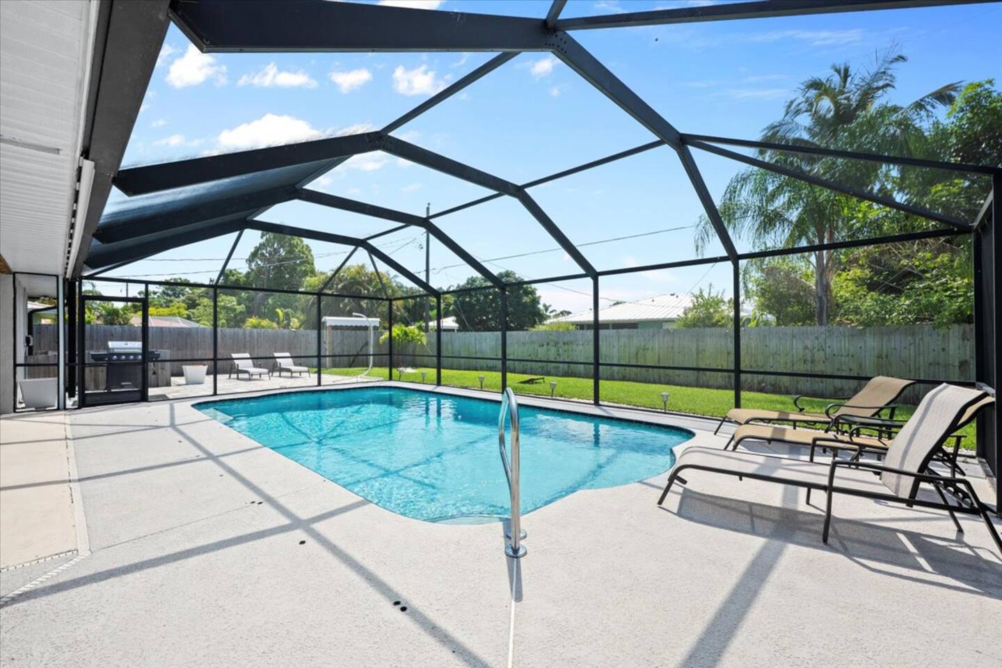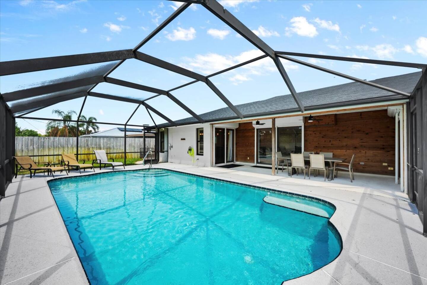 🛏️ The Space 4 comfortable bedrooms with fresh linens & closet space 2 full bathrooms with essentials & fluffy towels 🧼🚿 Bright, open living area with Smart TV & high-speed Wi-Fi 📺💨 Fully equipped kitchen with everything you need to cook at home 🍽️🍳 Dining area plus breakfast bar—perfect for meals or game nights 🎲 In-home washer & dryer 🧺 🌊 Outdoor Oasis Private screened-in pool—perfect for swimming, sunbathing & relaxing 🏊♂️🩴 Covered patio with outdoor seating for al fresco dining or morning coffee ☕🌤 Fenced yard for added privacy & peace of mind 🌳 📍 Prime Location 15–20 mins to Jensen Beach, Stuart, & Treasure Coast shores 🏖️ Close to PGA Golf Club, Clover Park (Mets spring training), shopping, & dining 🛍️🍔 Easy access to I-95 & US-1 for day trips or commuting 🚗 ✅ Family-friendly ✅ Central A/C ✅ Self check-in ✅ Free driveway parking This home has everything you need for a relaxing, sunny escape in Port St. Lucie—whether you're splashing in the pool, exploring nearby beaches, or just enjoying time with loved ones. 🌞 Book your stay today and make lasting memories in this Florida gem! ✨